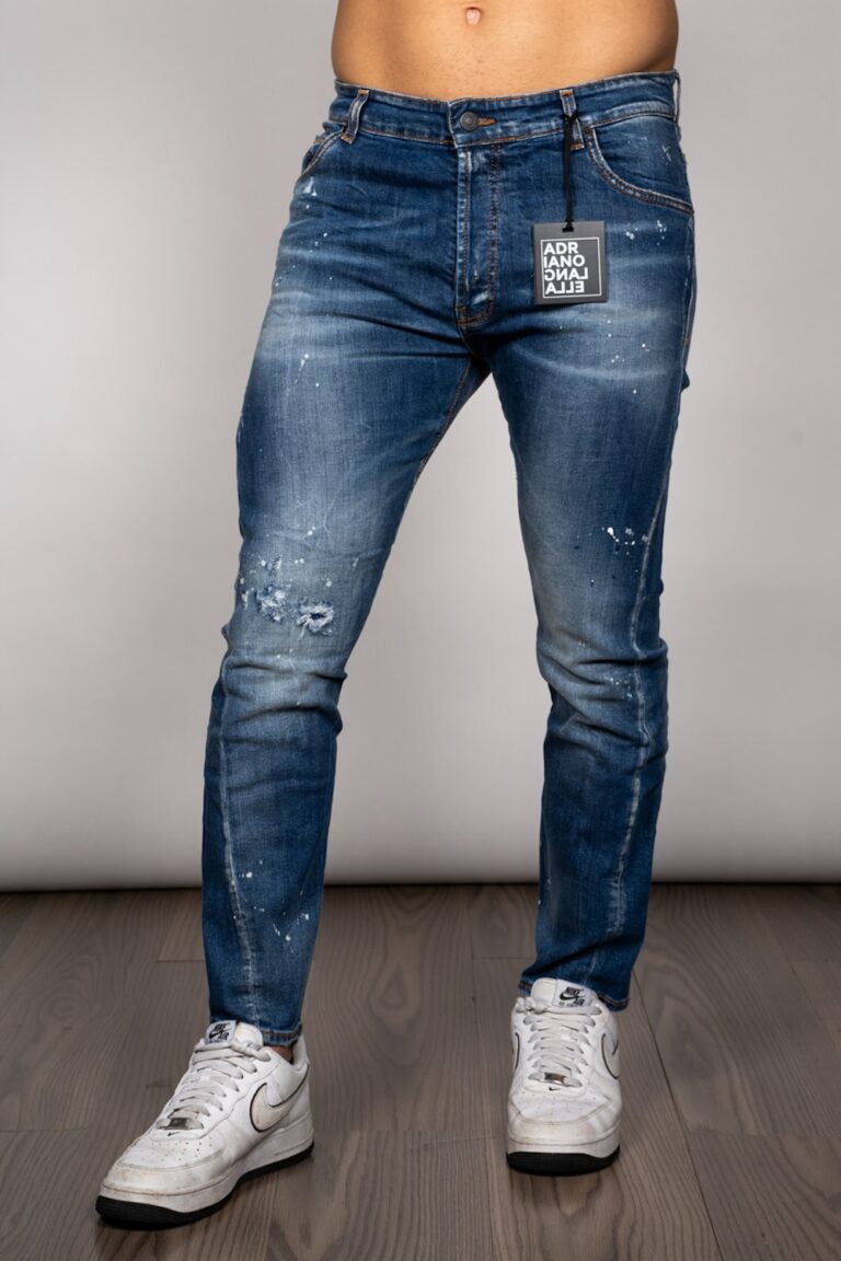 Дънки със скъсан ефект и сини пръски от боя