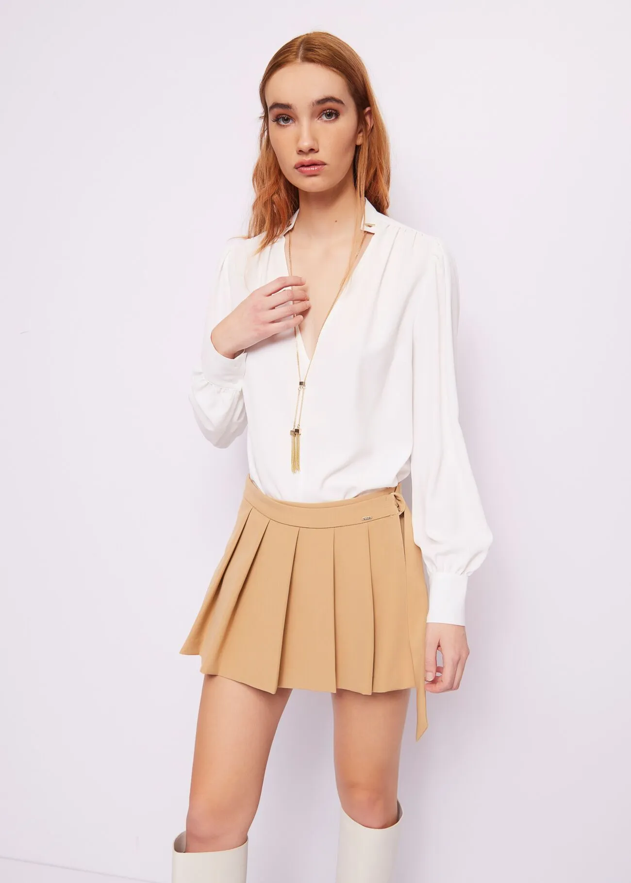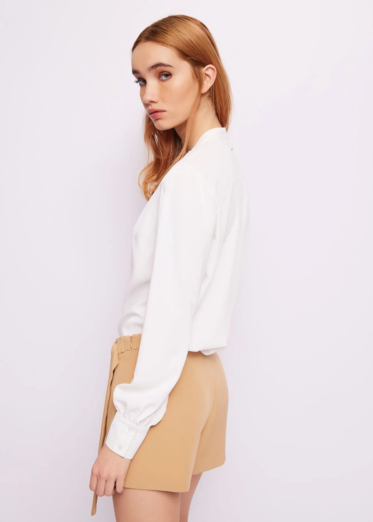Блуза с дълъг ръкав с дълбоко V-образно деколте и бижу закачено на ревера. Моделът е висок 175см и носи размер S. Пране и грижа: Следвайте инструкциите на вътрешния етикет. Състав: 100% полиестер