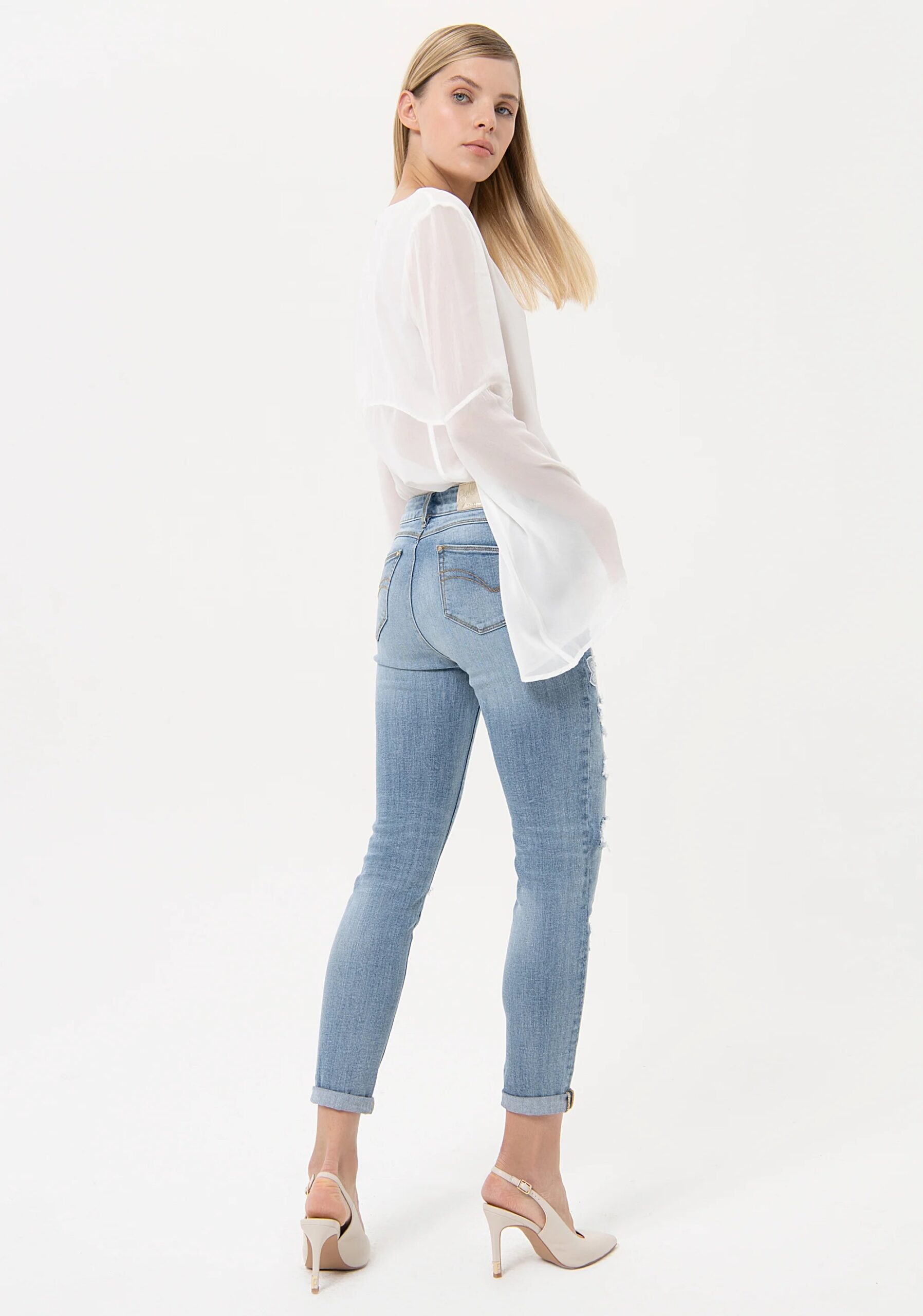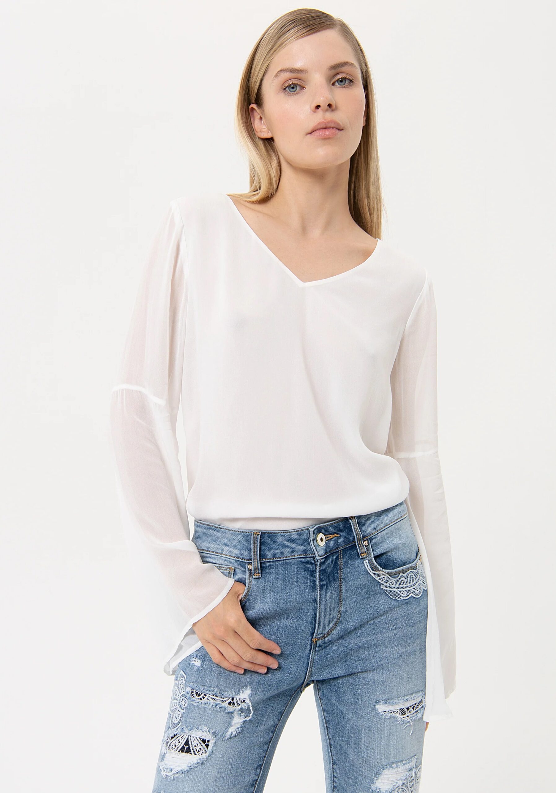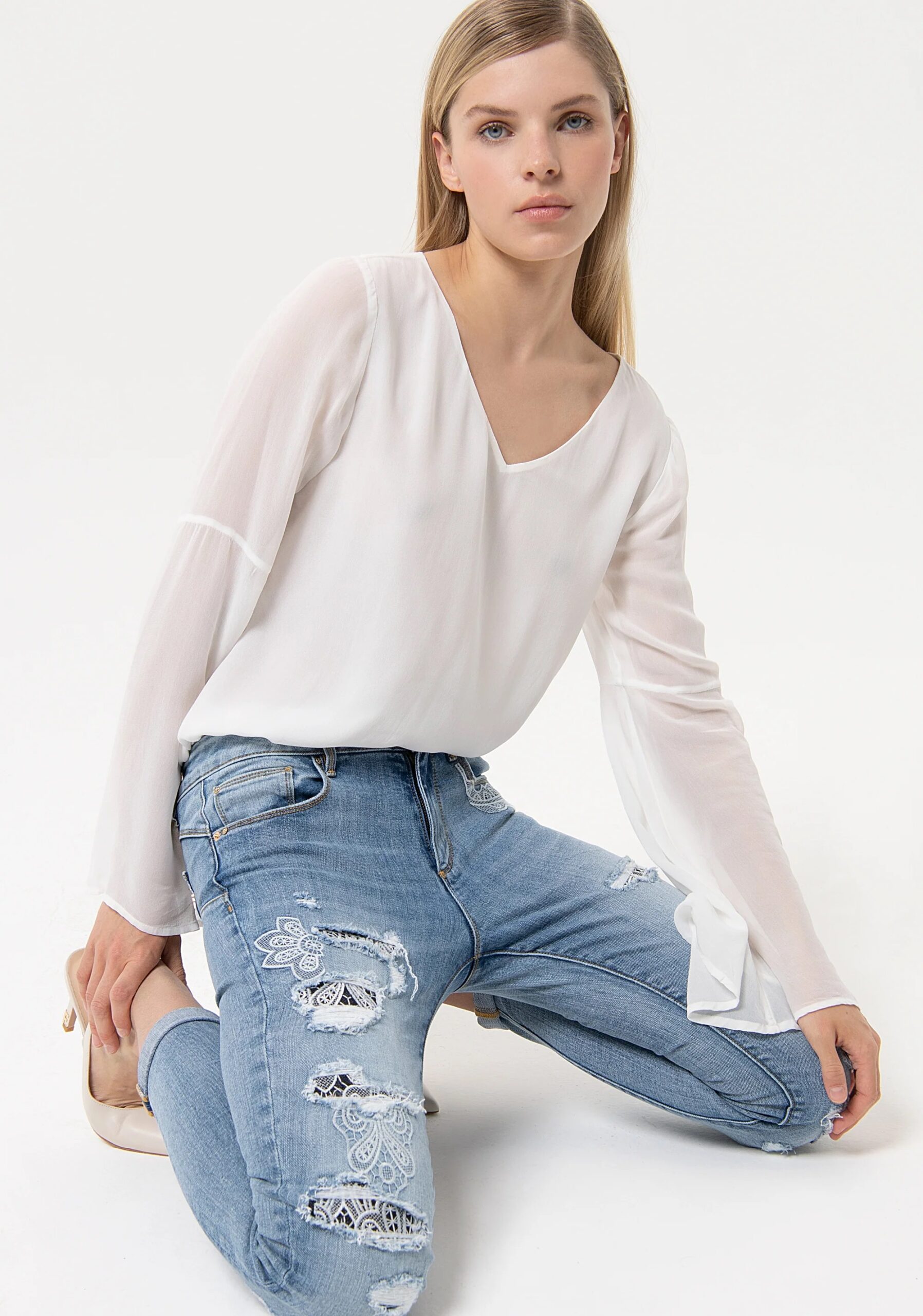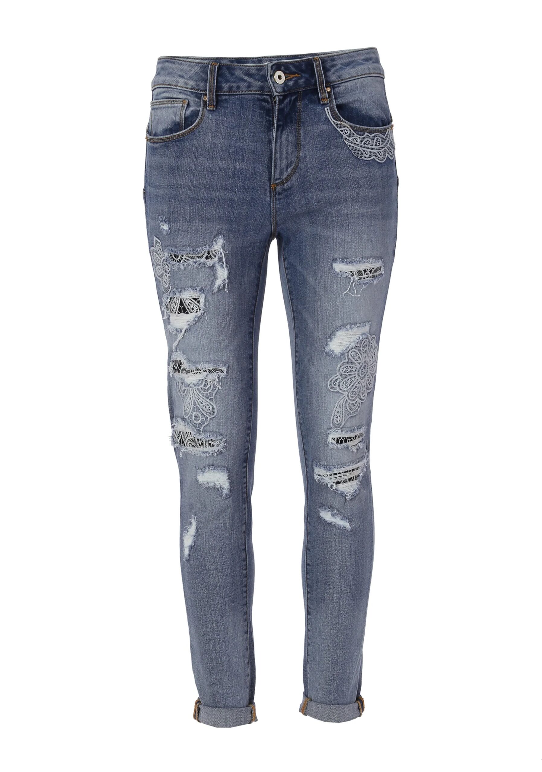 Дънки с бродирани кръпки и дантела